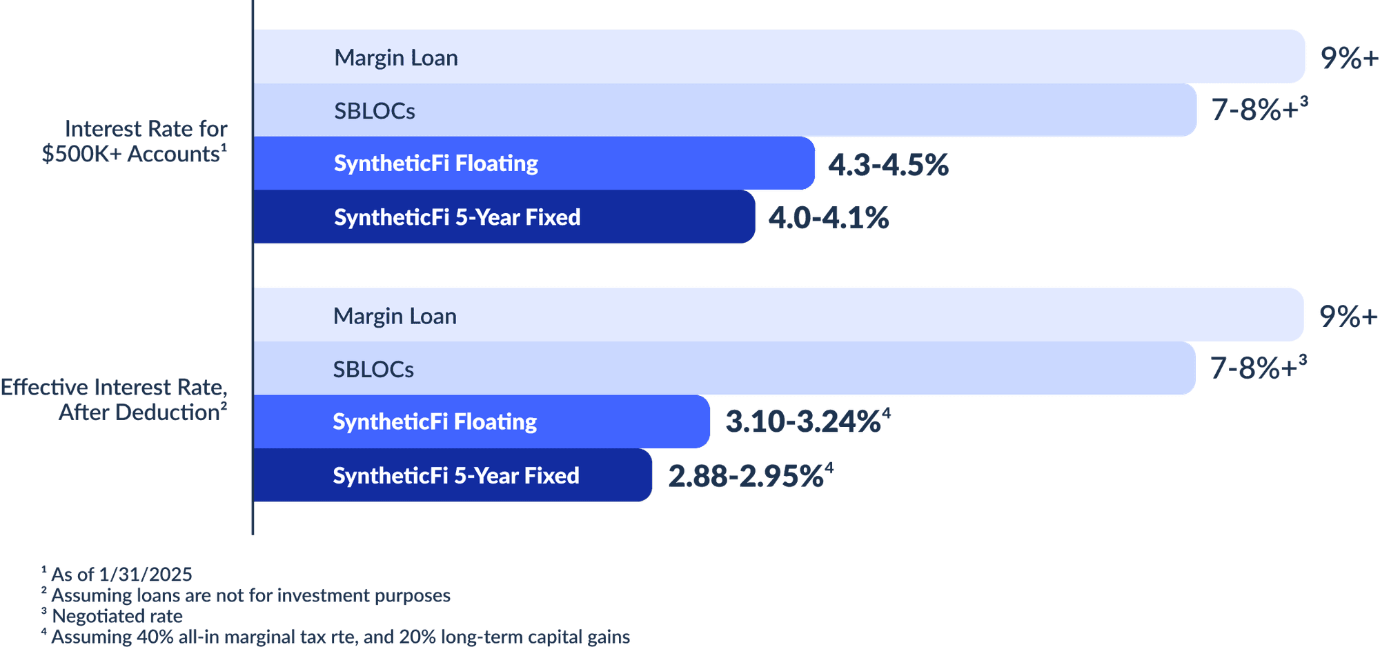 Since the interest expenses on a SyntheticFi loan is always tax-deductible, regardless of use, we offer superior effective interest rates on funds borrowed with our strategy (after deduction):